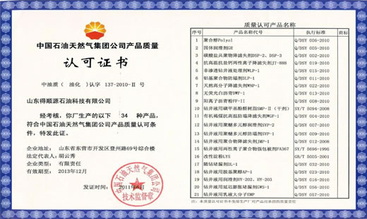 公司建立了先進完善的內(nèi)控體系和質(zhì)量控制體系,通過了API spec Q1及API 13A認證、ISO9001質(zhì)量管理體系認證、14001環(huán)境體系認證、18001職業(yè)安全健康體系認證、HSE健康安全環(huán)保體系認證和CNPC油田化學劑質(zhì)量認證。
